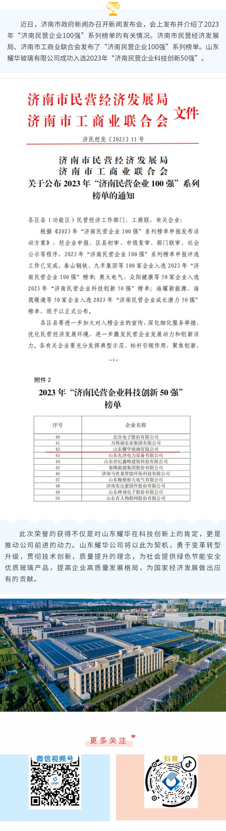 喜报 | 热烈祝贺山东耀华入选2023年“济南民营企业科技创新50强”