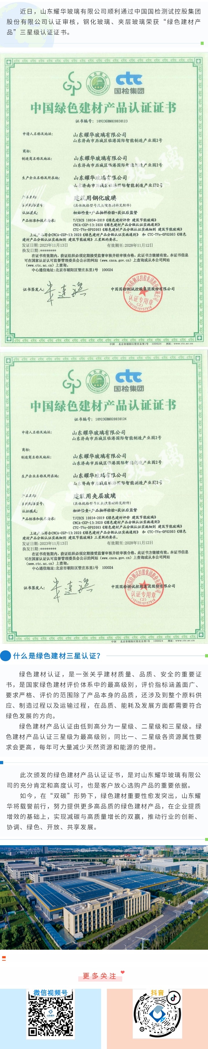 喜讯 | 山东耀华钢化玻璃、夹层玻璃荣获“中国绿色建材产品认证”三星级认证证书